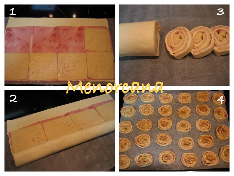 1.- Estirar el hojaldre, poner el jamón y el queso encima.2.- Enrollar